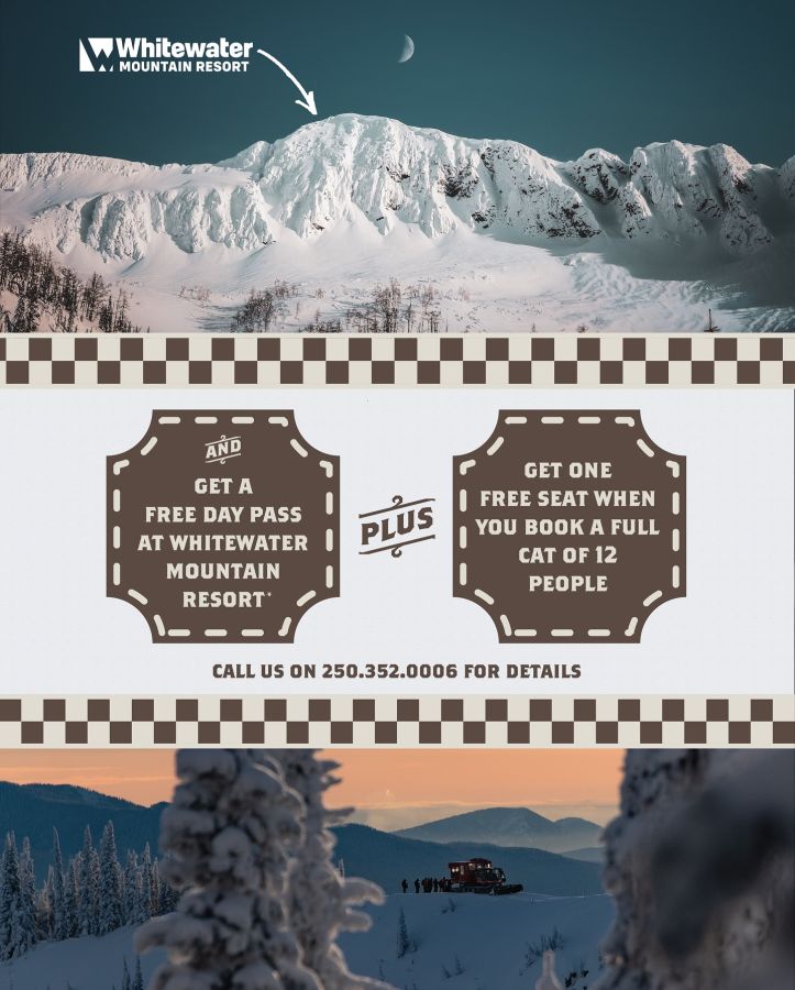 Come and fully experience the Kootenays with this bundle package from Baldface Valhalla. For any new booking of 2 or 3 days catskiing you will also get a day pass at the legendary Whitewater Ski Resort. Hit up the hill as a warm up to your Baldface Valhalla day or after. Enjoy the night life of Nelson BC in between days where we have discounts set up at preferred hotels. There is always a local around willing to show you the best of times!